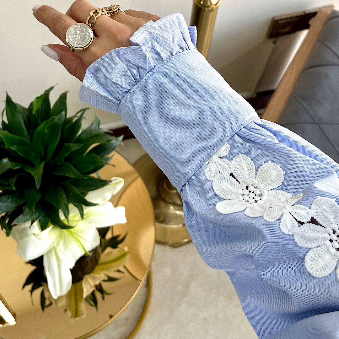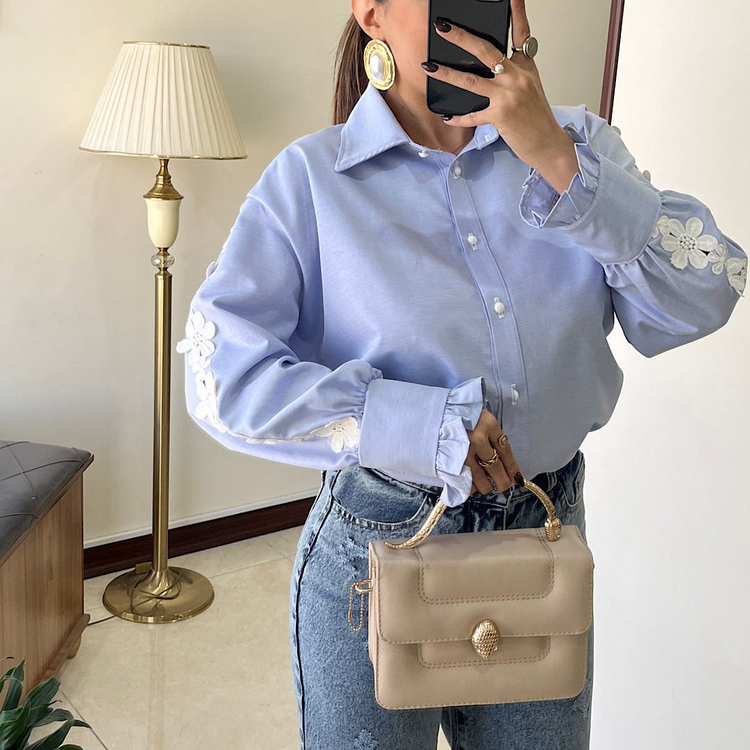 شومیز بهار جنس نخی روی استین گیپور کار شده یقه شومیز دکمه مرواریدی قد ۷۰ دور سینه ۱۲۵ سرشانه افتاده ( اندازه از گوشه گردن ۱۵ سانت)
